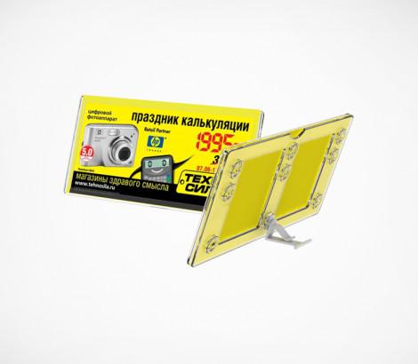 Универсальная рамка-ценникодержатель с девятью гнездами крепления рамки на разных уровнях относительно полки. Прорезь для рамки по широкой стороне рамки.