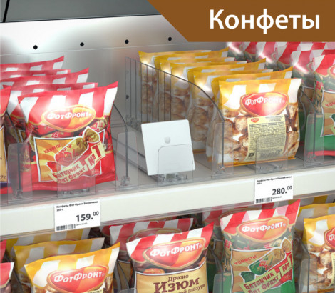 Пружинный толкатель FORTA QUADRA-2 имеет наклонную толкающую поверхность размером 75х74 мм и передний ограничитель размером 55х56 мм. Подходит для невысоких продуктов средней и высокой тяжести, например: квадратных плиток шоколада, конфет в пакетированной упаковке.