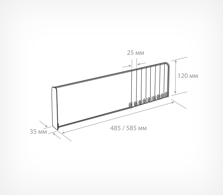 Применяется при выкладке товаров средних и крупных размеров. Ограничитель предотвращает падение товара, расположенного у переднего края полки.