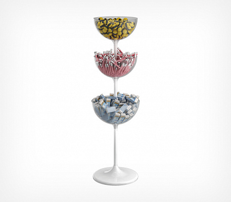 Дисплей UNIBOWL-TOWER-3 (24-17-17) предназначен для выкладки продовольственных и непродовольственных товаров в компактной упаковке. Состоит из трёх чаш для увеличенной выкладки одного или трёх и более товаров и ещё более эффективного использования торговой площади, состоит из нескольких частей, которые легко собираются между собой без использования инструмента: пластиковое основание, труба длиной 520 мм, две трубы по 410 мм, пластиковые прозрачные чаши объёмом 17 литров — 2 штуки и 24 литра — 1 штука, заглушка, защищающая полость трубы.