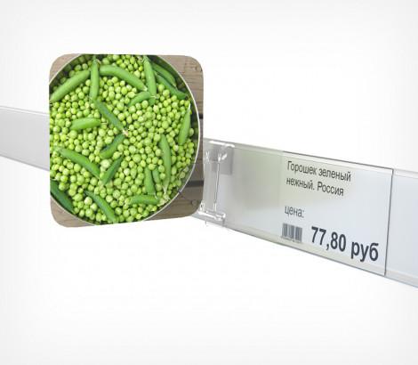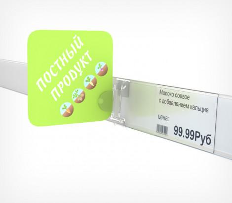 Клипса крепится на полочный ценникодержатель (высотой 39 мм) . Применяется для создания рекламных вывесок, которые размещаются рядом с товаром на полке и содержат информацию о товаре или акции. В качестве стоппера используются ламинированный картон или тонкий пластик до 0,8 мм. В держателе предусмотрен специальный штырек, который, фиксирует стоппер в держателе.