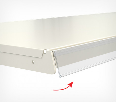 Универсальный откидной самоклеящийся ценникодержатель фиксируется к кромке полки на скотч, нанесенный на ценникодержатель.  Сохраняет ориентацию к покупателю при креплении на поверхности под любым углом. Может подклеиваться под другие полочные ценникодержатели для увеличения количества выставляемых ценников
