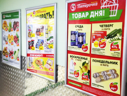 Подвесные двухсторонние рамы из алюминиевого KLIK профиля одно из популярных средств размещения рекламной информации. Используются для рекламы товаров, специальных предложений акций, обычно в витринах магазина кафе или любой другой организации. Привлекают внимание как при взгляде с улицы или внутри помещения. Для замены информации нет необходимости снимать рекламный носитель с креплений, информация легко меняется.